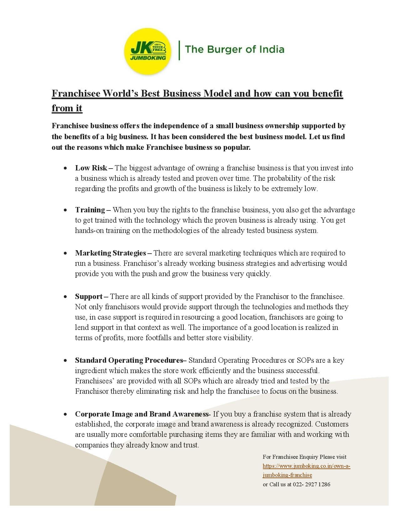 Jumbo King is a chain of fast food restaurants based primarily in Mumbai, specializing in the Maharashtrian regional dish vada pav. Established in 2001 by husband and wife Dheeraj and Reeta Gupta, the company was inspired by the fast food business model of McDonald's and Burger King.[3][4] Jumbo King Foods Pvt. Ltd is a franchisee-based company that operates across many areas of India. From its beginnings in Malad, a suburb of Mumbai, it has spread across the whole Mumbai Metropolitan Region (MMR), as well as Bangalore, Hyderabad, Indore, Lucknow, Aurangabad and Gujarat.[1] Pls. visit : https://www.jumboking.co.in/ and apply for franchise. Pls. also check the attached file.